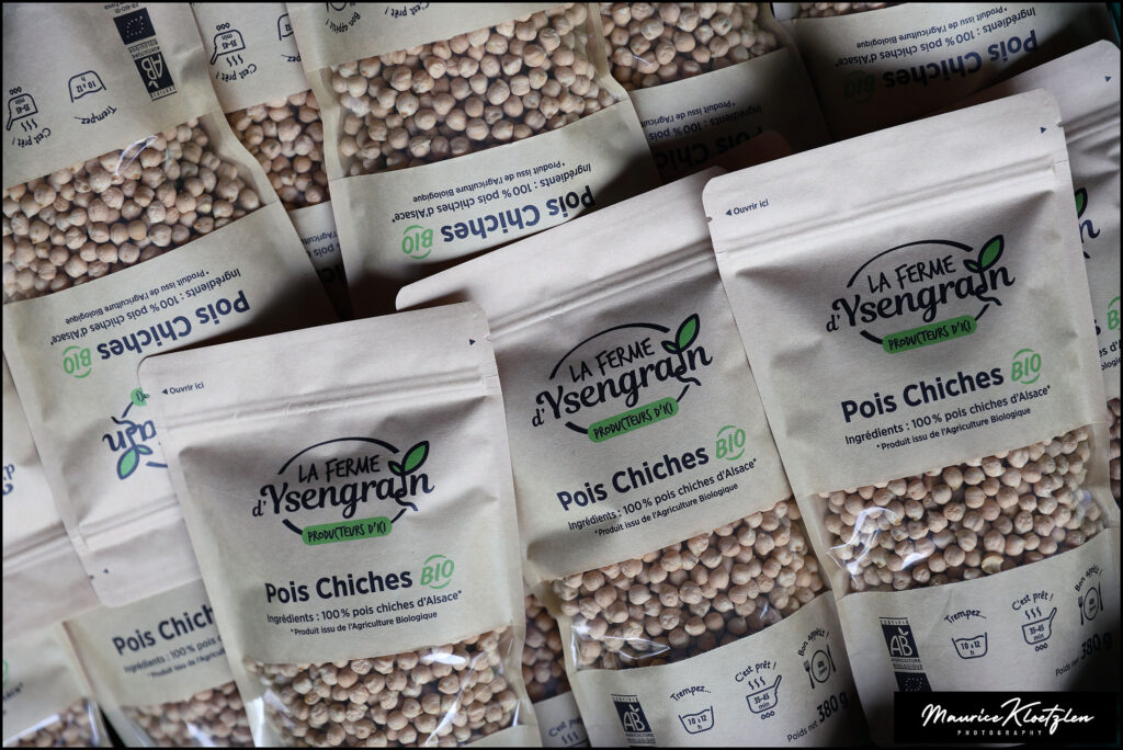 Matthieu a introduit le maïs popcorn pour diversifier la vente directe sans nécessiter d’investissements supplémentaires. Le choix de cultiver des pois chiches, une culture originale en Alsace, a été motivé par l’envie d’expérimenter et par des conditions climatiques favorables, avec des étés chauds et secs et des sols peu humides, idéaux pour cette légumineuse.